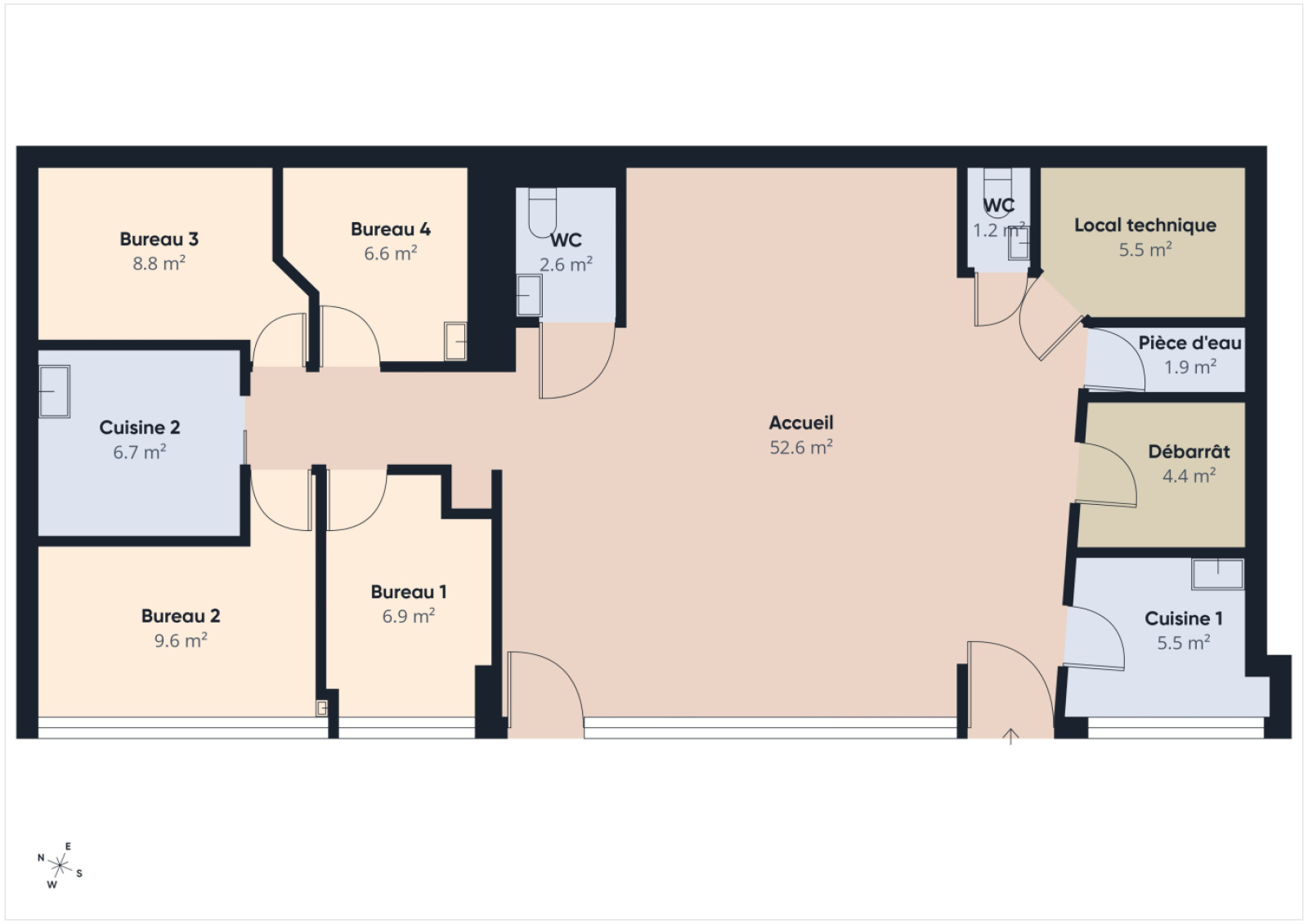 Il se compose d'une entrée ouvrant sur un espace d'accueil de 52 m², de quatre bureaux, d'une kitchenette, d'une cuisine équipée, de deux toilettes ainsi que de nombreux espaces de rangement.