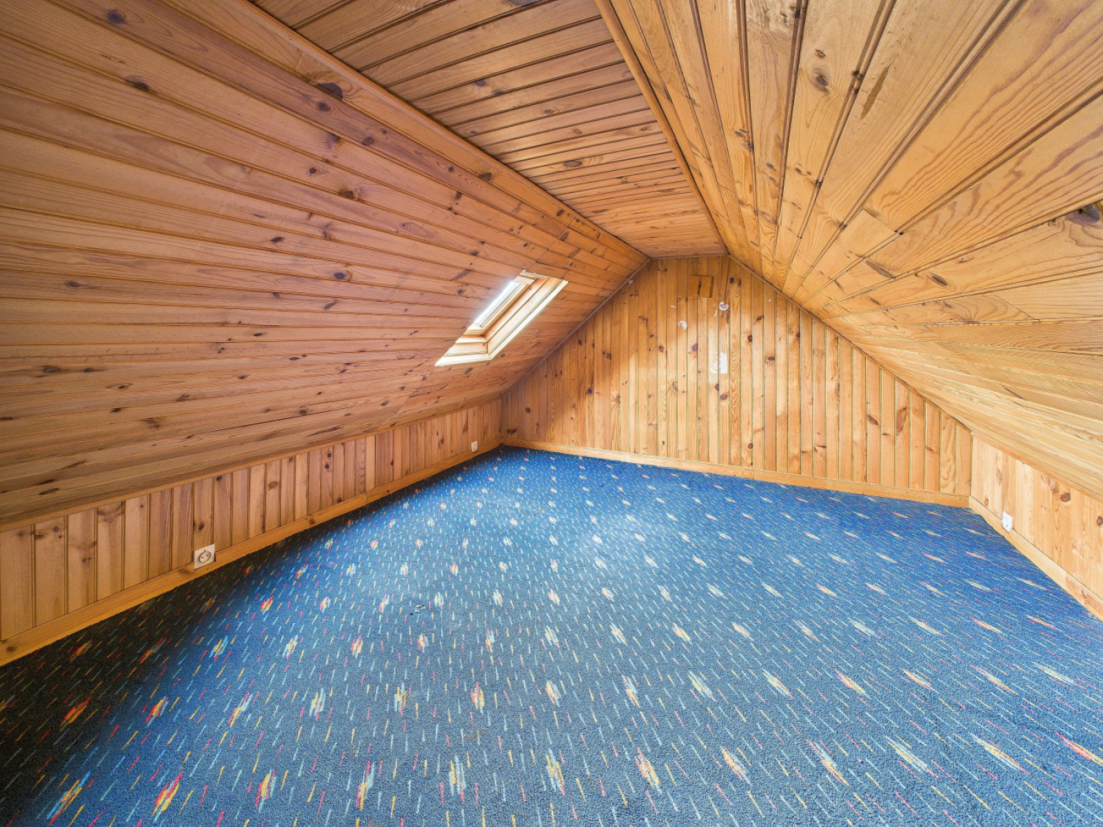 À l'étage, la maison propose trois chambres ainsi qu'une salle de bains. Les combles, accessibles, offrent une pièce supplémentaire pouvant servir de petit espace de rangement, de bureau d'appoint ou de coin loisirs ; on y tient debout principalement au centre, ce qui en fait un volume d'appoint à utiliser selon ses besoins.