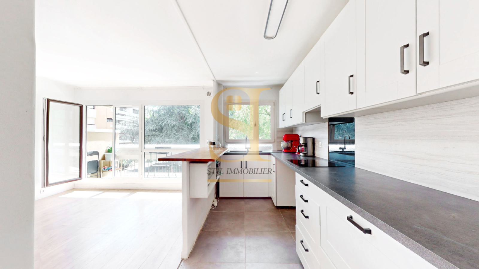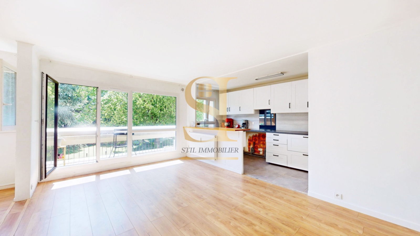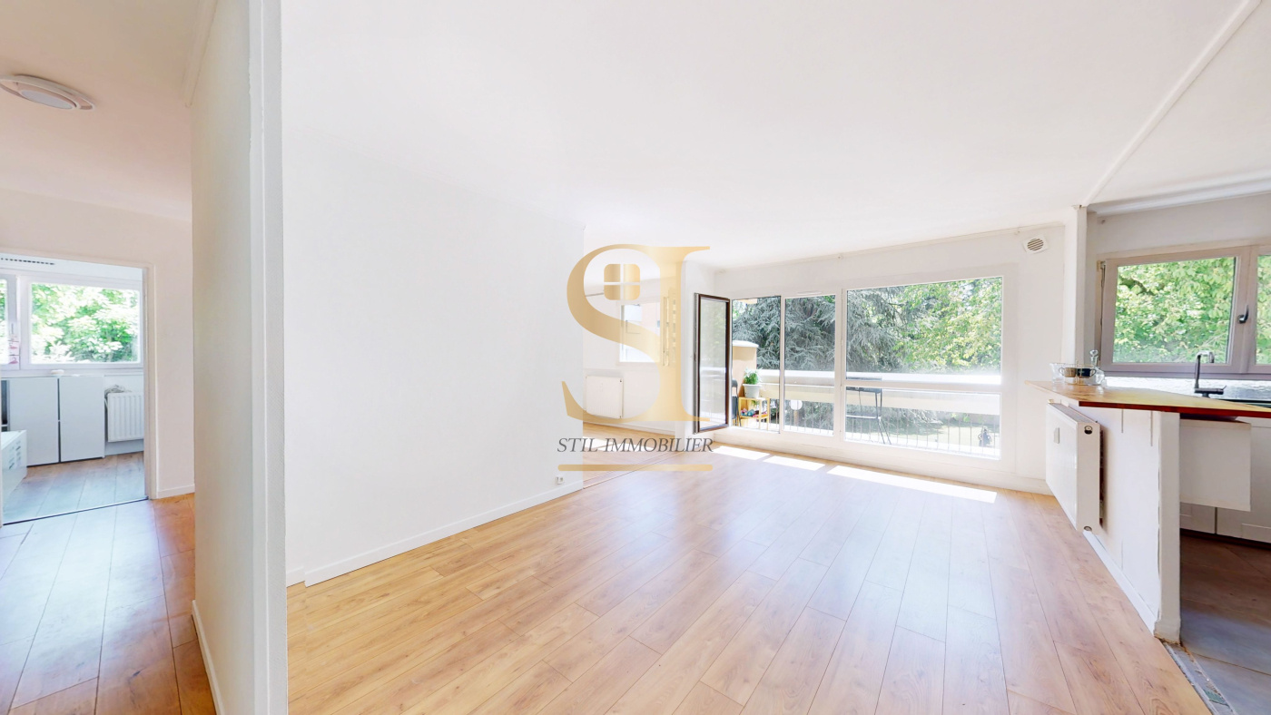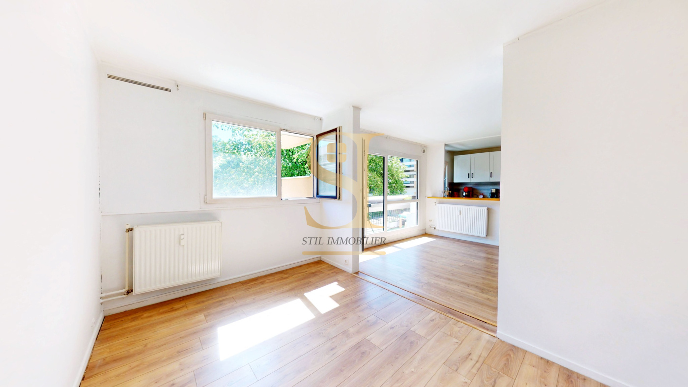 Un grand séjour lumineux de 18,23 m² avec cuisine ouverte, créant un bel espace de vie convivial, avec accès au balcon