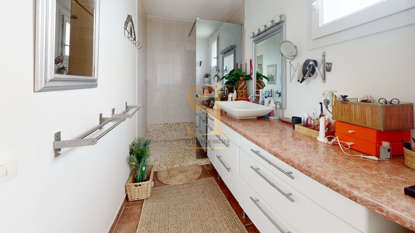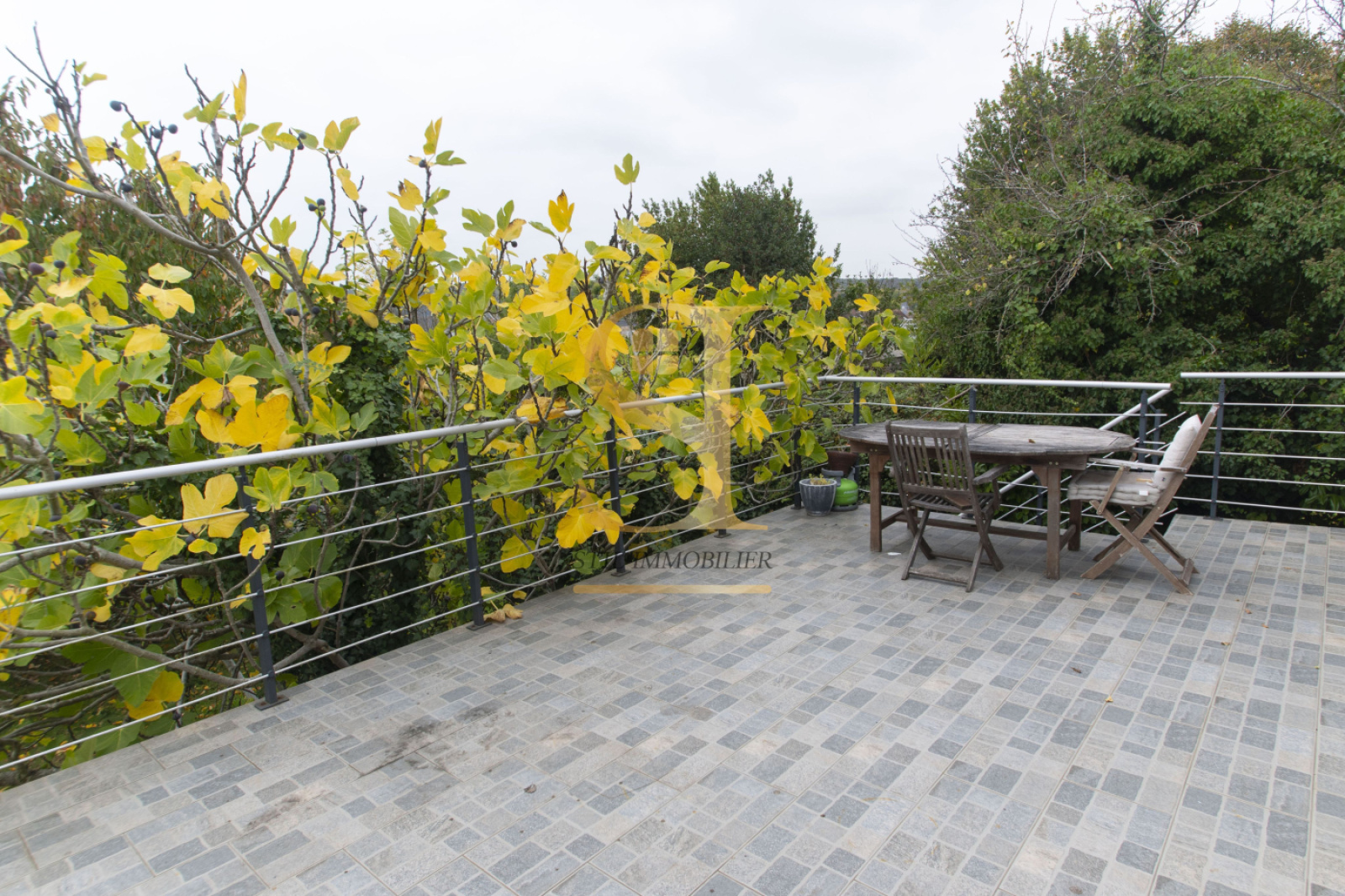 A l'étage vous découvrirez un vaste double séjour lumineux avec cuisine américaine entièrement aménagée, équipée et baignée de lumière, le tout pour 50 m² environ, avec un accès direct sur une grande terrasse, avec une jolie vue sur un magnifique figuier.